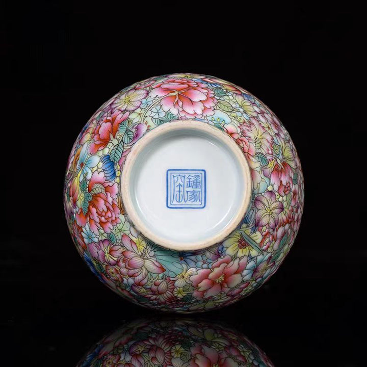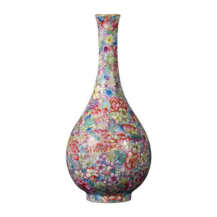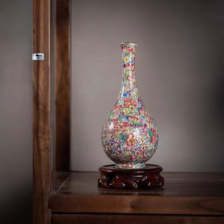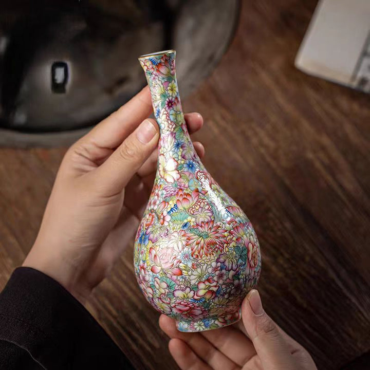 This Famille Rose 'Ten-Thousand Flowers' handcrafted ceramic vase represents the pinnacle of Qing Dynasty imperial kiln craftsmanship, renowned for its exquisite complexity and opulence. The vase is entirely covered with a dense, uninterrupted tapestry of enamel-painted blossoms—including peonies, lotuses, chrysanthemums, and plums—symbolizing a flourishing age and the auspicious harmony of all seasons. Mastering artisans employ exceptional painting skills to hand-render this "Ten-Thousand Flowers" pattern, utilizing the uniquely vibrant and subtly graded Famille Rose palette. Achieving its luminous, glass-like finish requires multiple low-temperature firings, each demanding precise control. As a synthesis of masterful painting, brilliant enamels, and technical firing prowess, this vase is not merely a decorative object but a treasured art piece embodying the prosperity and artistry of a golden era.